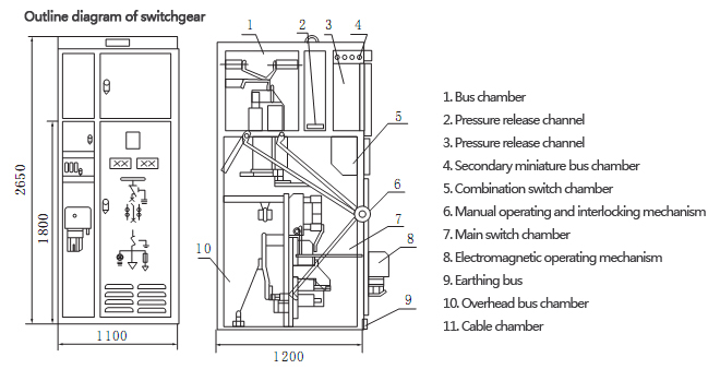 Main switch of the switchgear adopts ZN28A-10 series vacuum circuit breaker that is equipped with CD17 series electromagnetic operating mechanism, CT17 or CT19B spring operating mechanism. It adopts CN30-10 rotary isolating switch series.