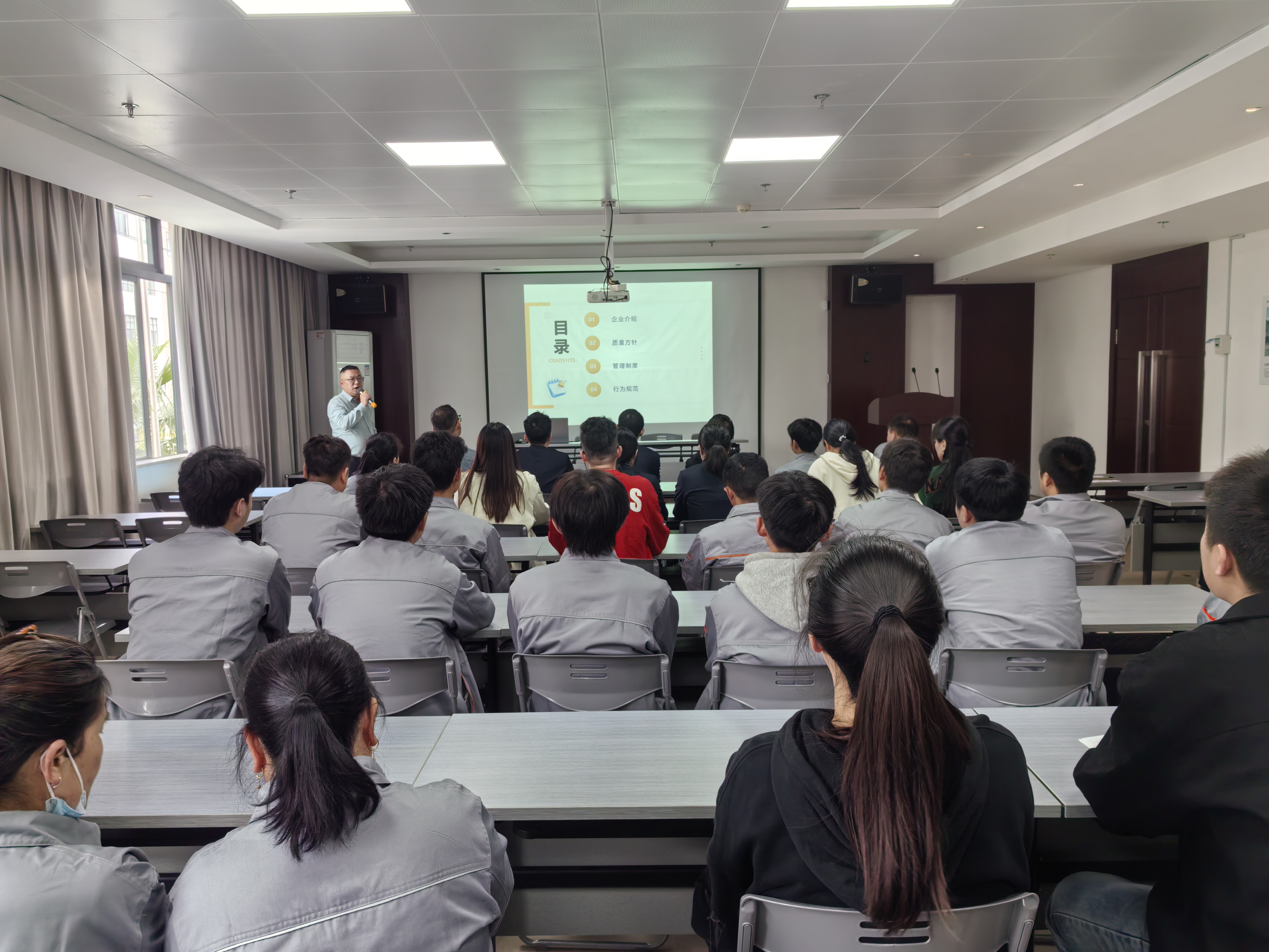 培訓開始,行政部經理首先代表公司對新入職的員工表示熱烈歡迎。接著采用PPT形式、以圖文并茂的方式展示,結合公司實際與案例,從企業介紹、質量方針、管理制度、行為規范等四個方面進行全面的講解。